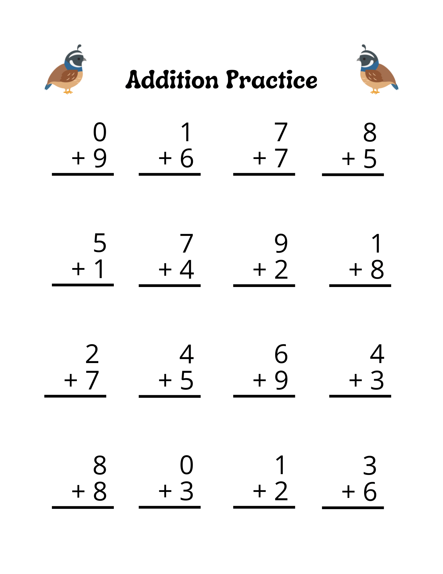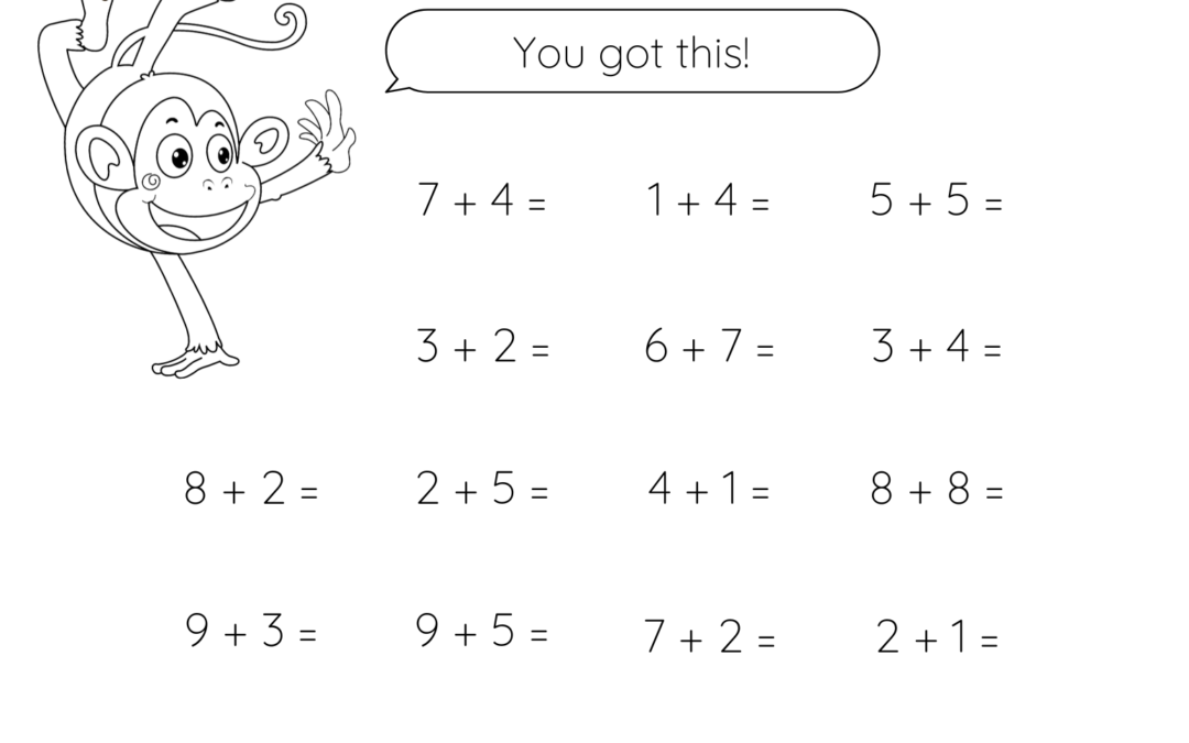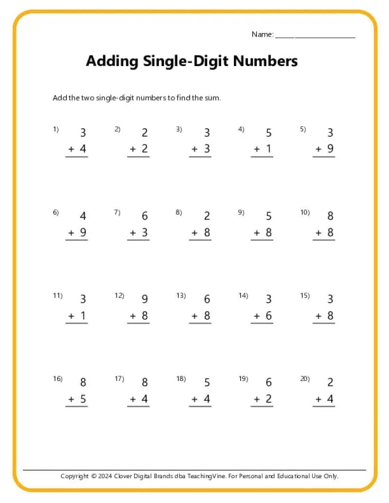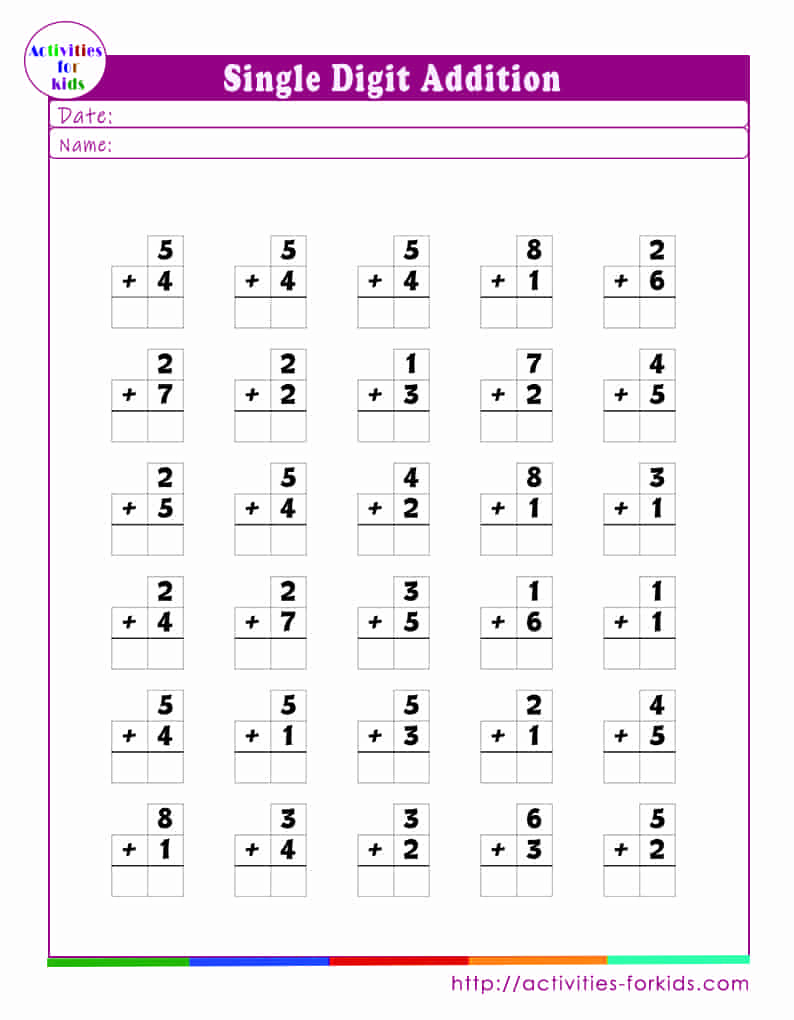 printable single digit addition worksheet kids