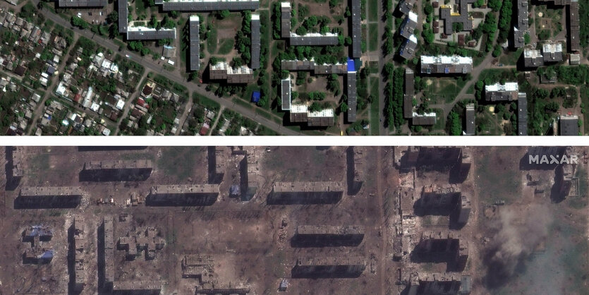 obrazem bachmut rok pote satelitni snimky ukazuji devastaci mesta