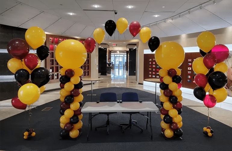 balloon arch gold red balloons hanging sides room