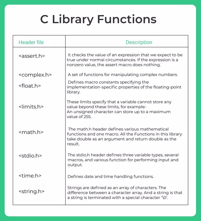 Tidak hanya C Library Function, anda juga bisa melihat gambar lain seperti Standard Input/Output, Language, How Many, ANSI-standard, Programming, Example, What Are, Max, Sin, For Finding Max 2 Numbers, Transpose, Project Examples, Cheat Sheet, What Is Mean, UI Effect, Types C++, QBasic, Cmath, Code, Digital, Byju's, IC, and Thing Esp.