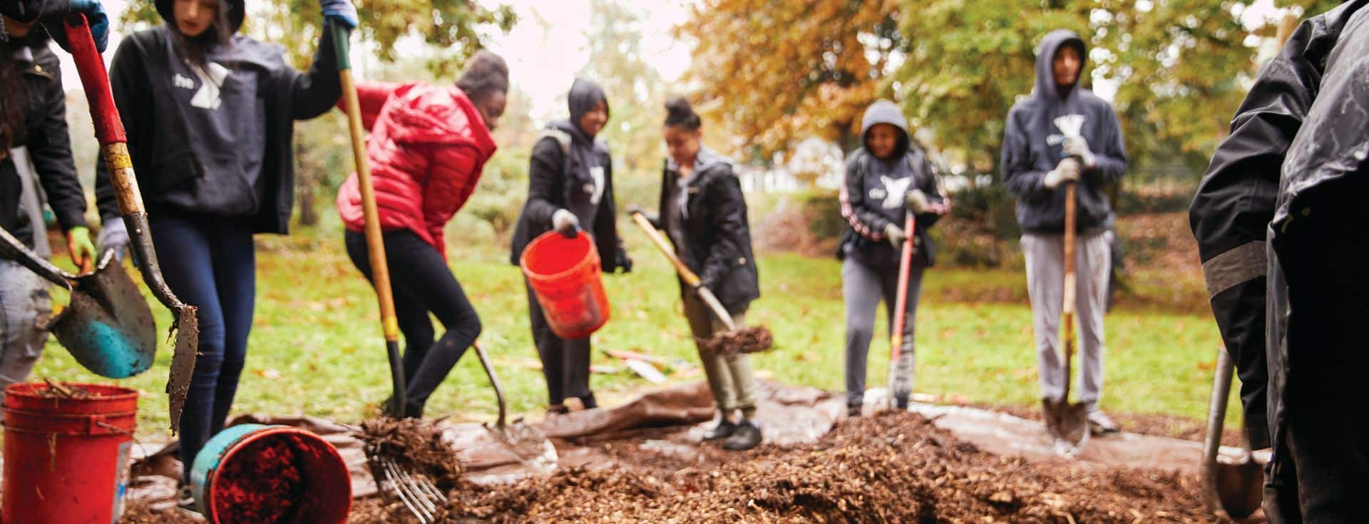 outdoor community setting volunteers smiling working