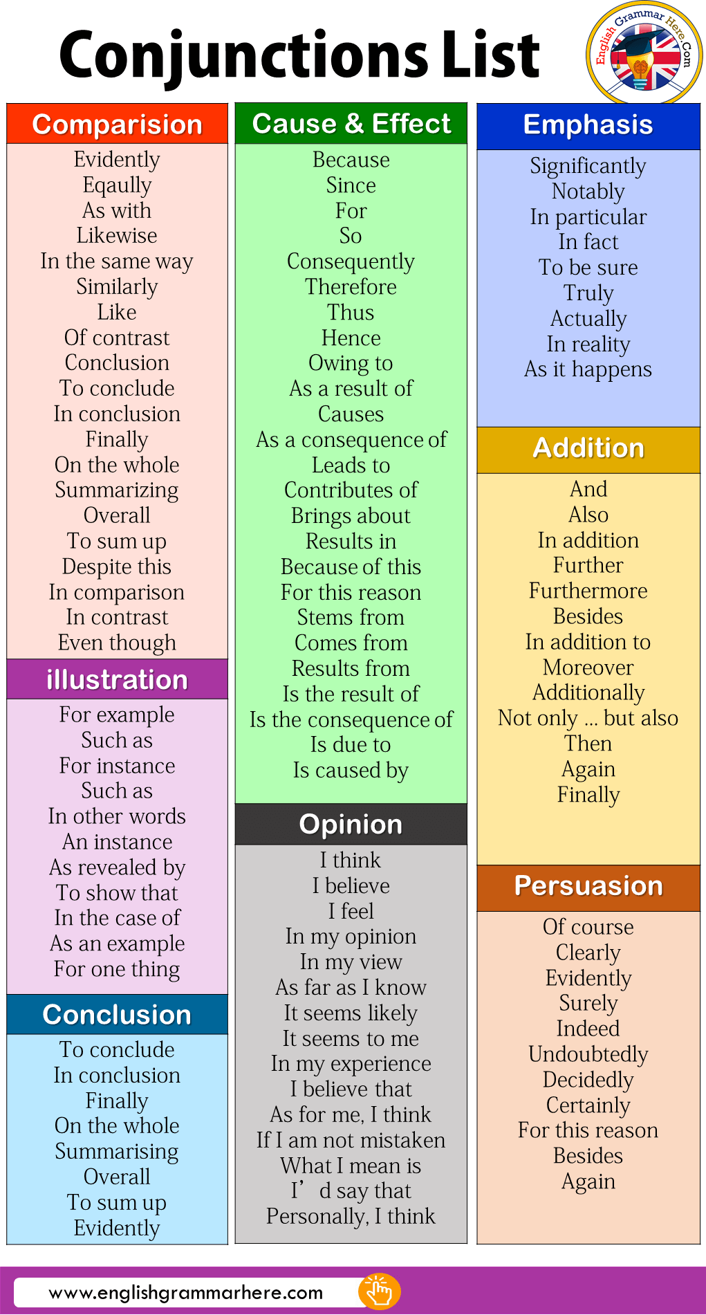 full list conjunctions english conjunction words esl