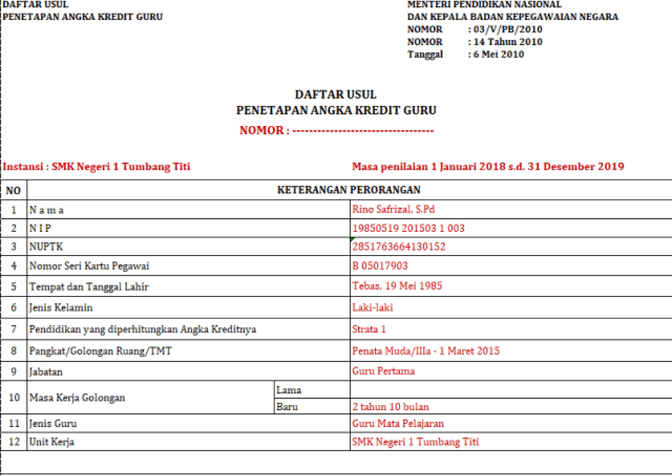 format contoh tabel angka kredit kenaikan pangkat guru