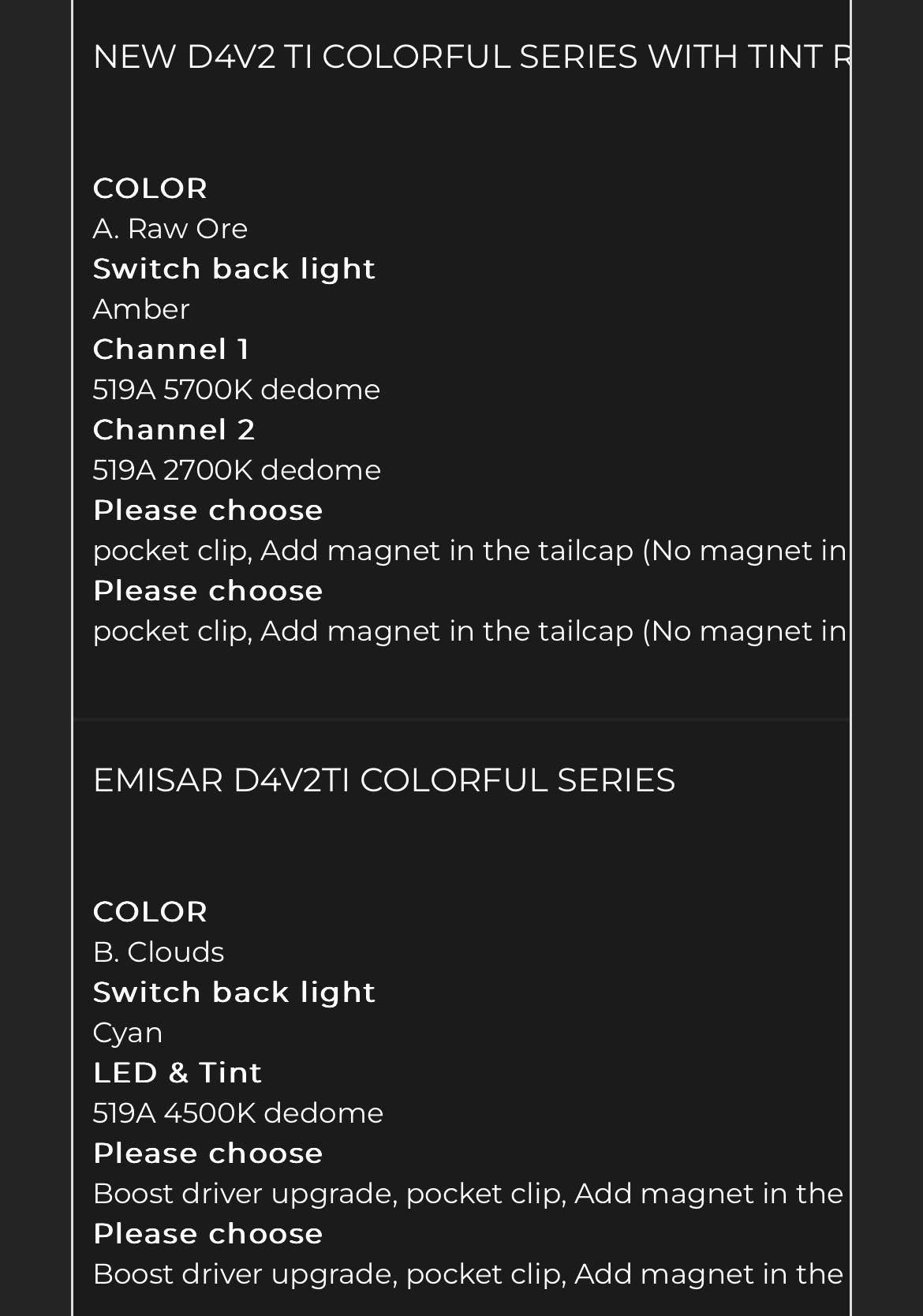 Tidak hanya D4v2, anda juga bisa melihat gambar lain seperti Cyan, Lumens, Green W-2, Brass, Flashlight, Diffuser, Anodized, Raw Ore, Emisar, 18350, D4sv2 vs, Tints, Dark Grey, Cyan Copper, Antique, Backlight, Titanium Anodize, Accessories, Cyan Copper Head, Amber Back Switch, Brass Stone White, Stonewashed, Boost Driver Turbo, and Backlight Colors.