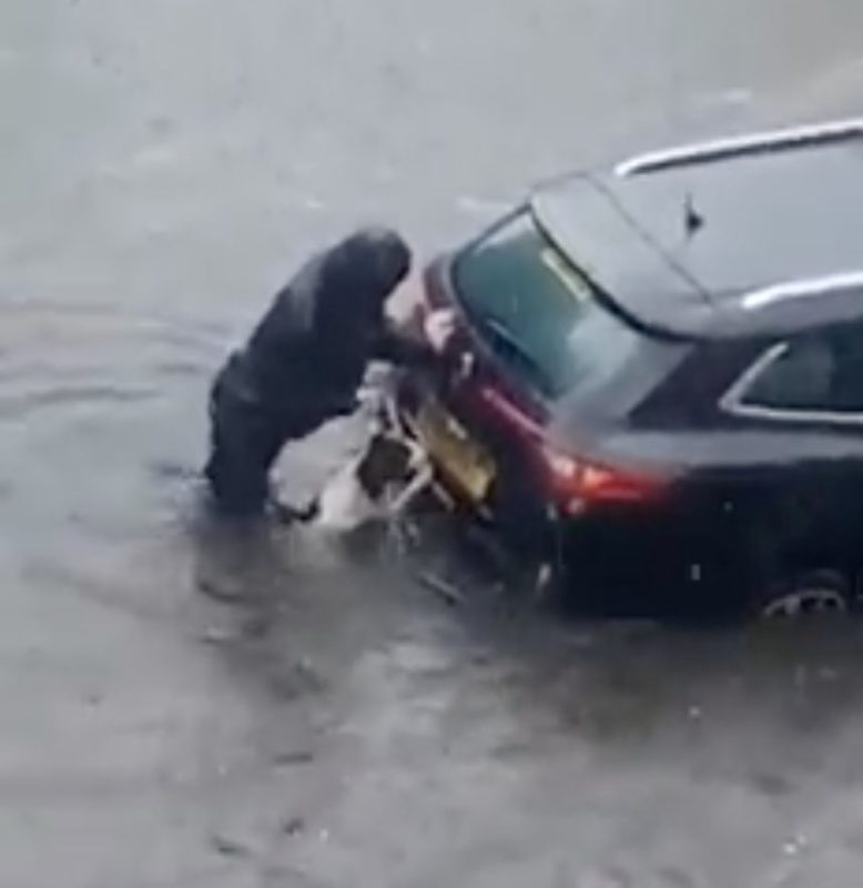smart dog helps owner push trapped car floodwater