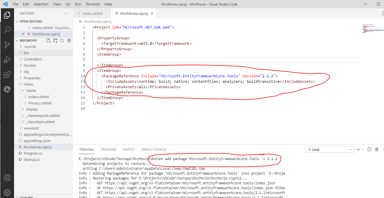 entity framework core commands code terminal visual studio
