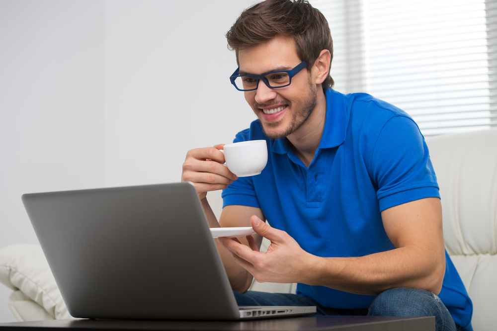 handsome young man working computer laptop home happy guy blank