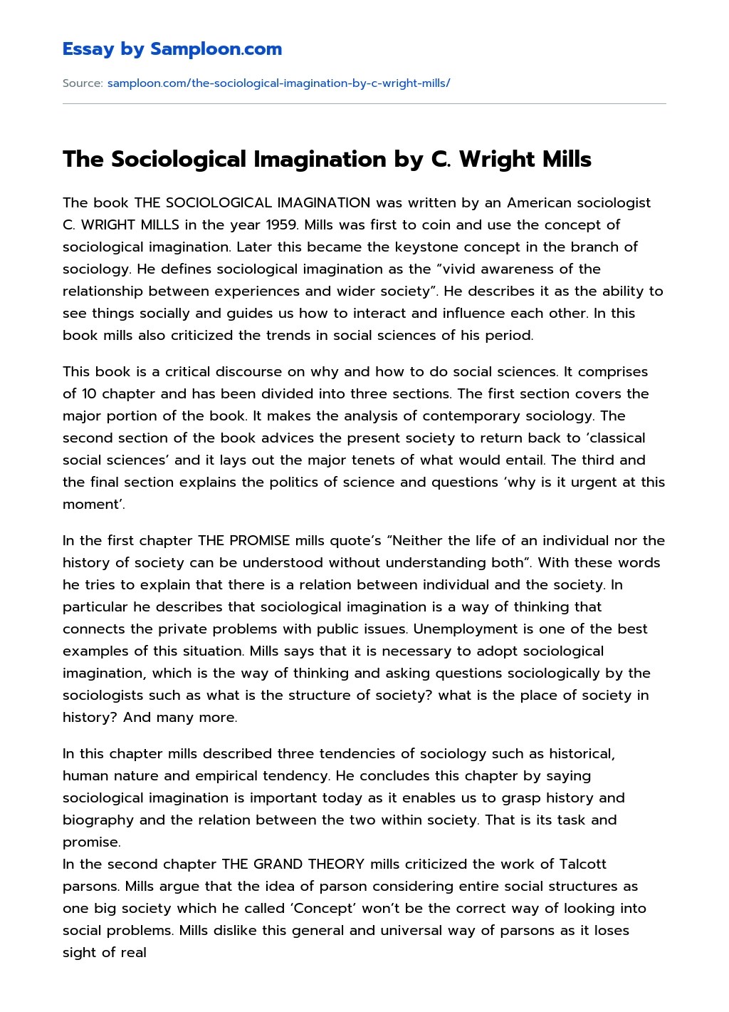 sociological imagination wright mills explanation essay