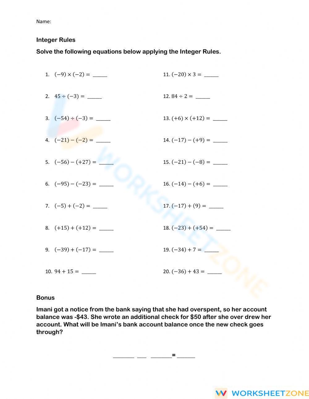Berbagai Contoh Integer Rules Worksheet