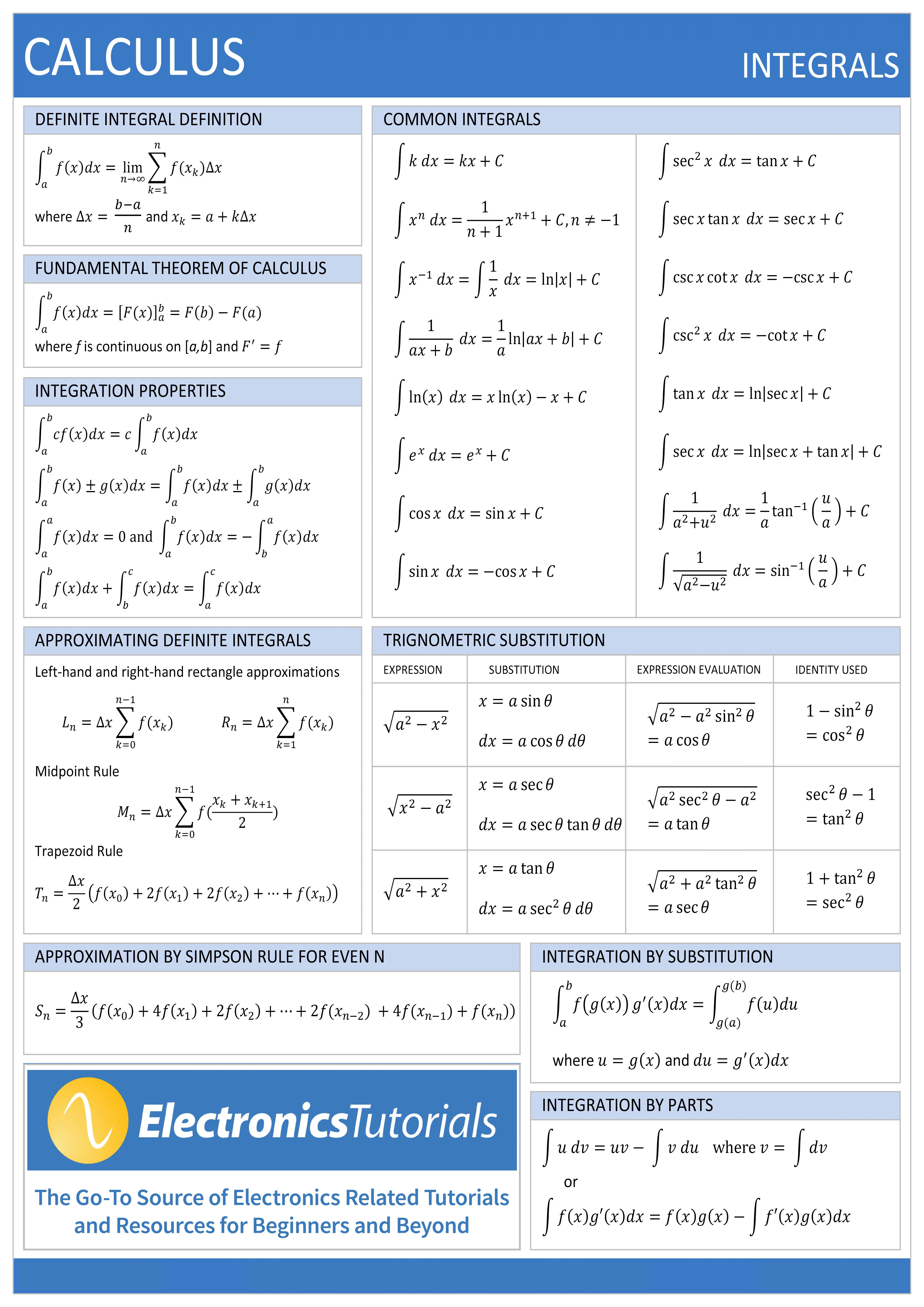 calculus integrals reference sheet electronics tutorials
