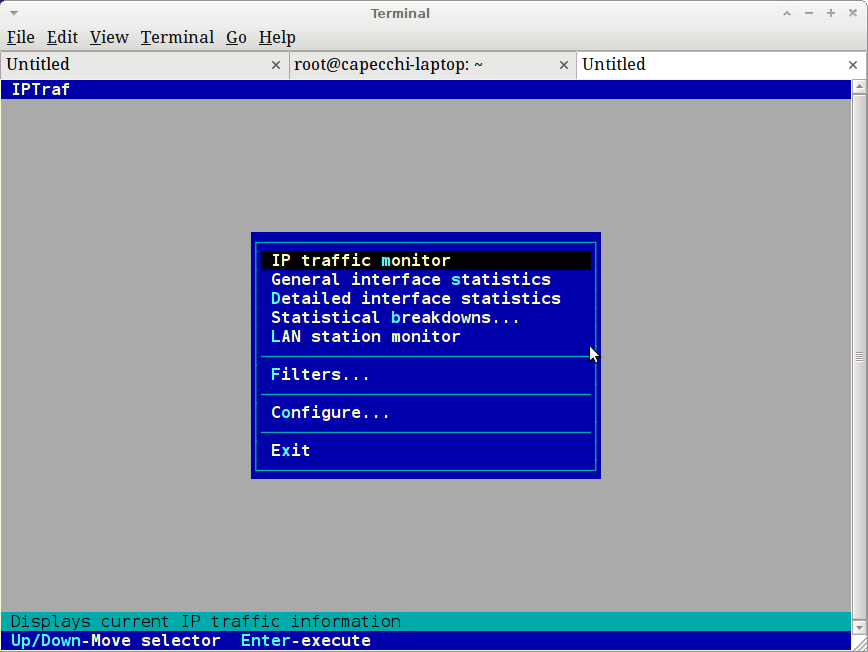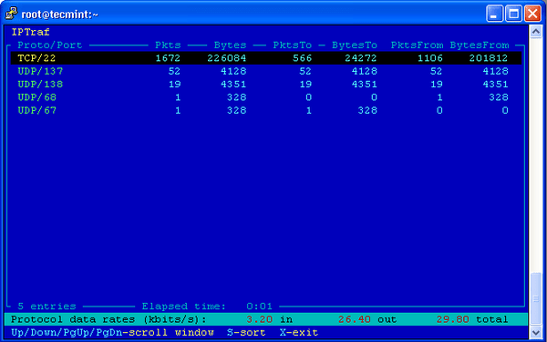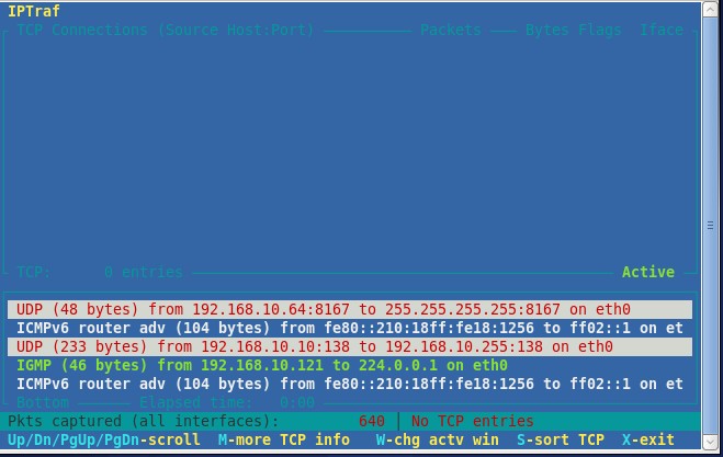 Tidak hanya Iptraf, anda juga bisa melihat gambar lain seperti Tcpdump, Ntop, Netcat, Wireshark, Ngrep, EtherApe, and Mrtg.