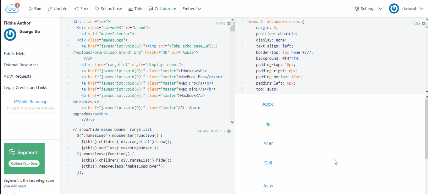 jquery dropdown menu show text hover stack overflow