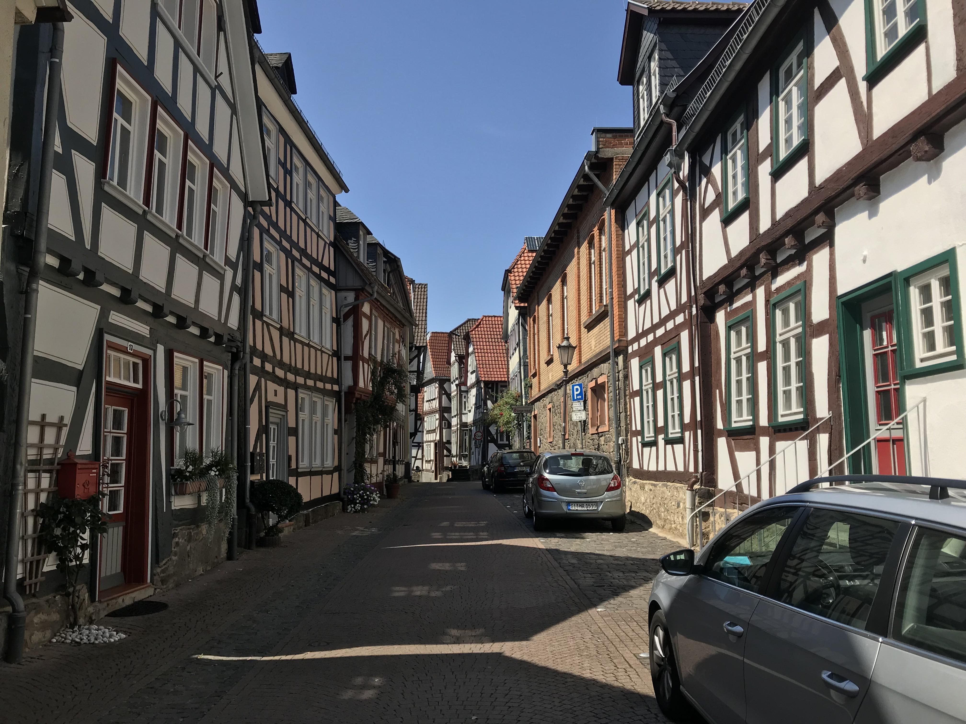 small street timbered houses lich hesse germany editorial