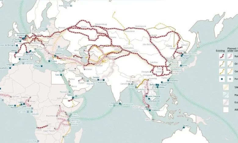 highlighted transport routes connect regions detailed global map