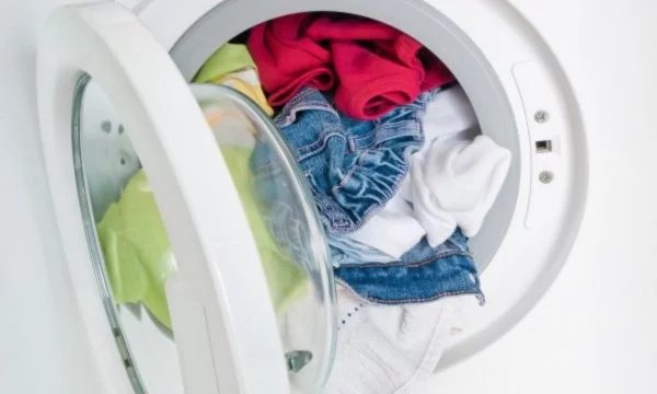 loading clothes white washing machine laundry room