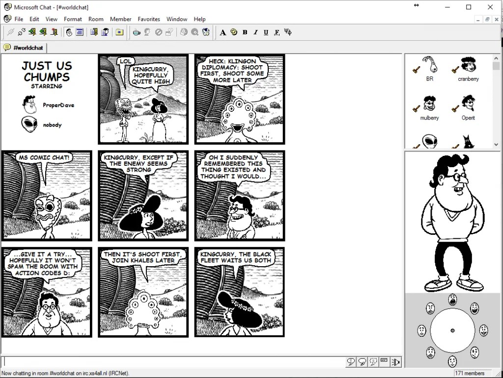 Tidak hanya Microsoft Comic Chat, anda juga bisa melihat gambar lain seperti Alien Landscape, Sprites, Download, 24 Different Languages, Connect Dialogue Box, Characters, mIRC, Trillian, Pidgin, LimeChat, Ircle, Colloquy, Infobot, ChatZilla, Pirch, Internet Explorer 3, WeeChat, and Amaya.