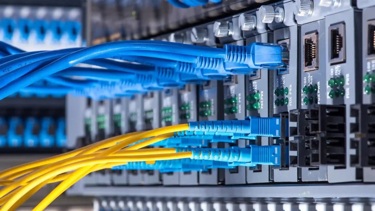 large multiport switch inserted red patch cord isp