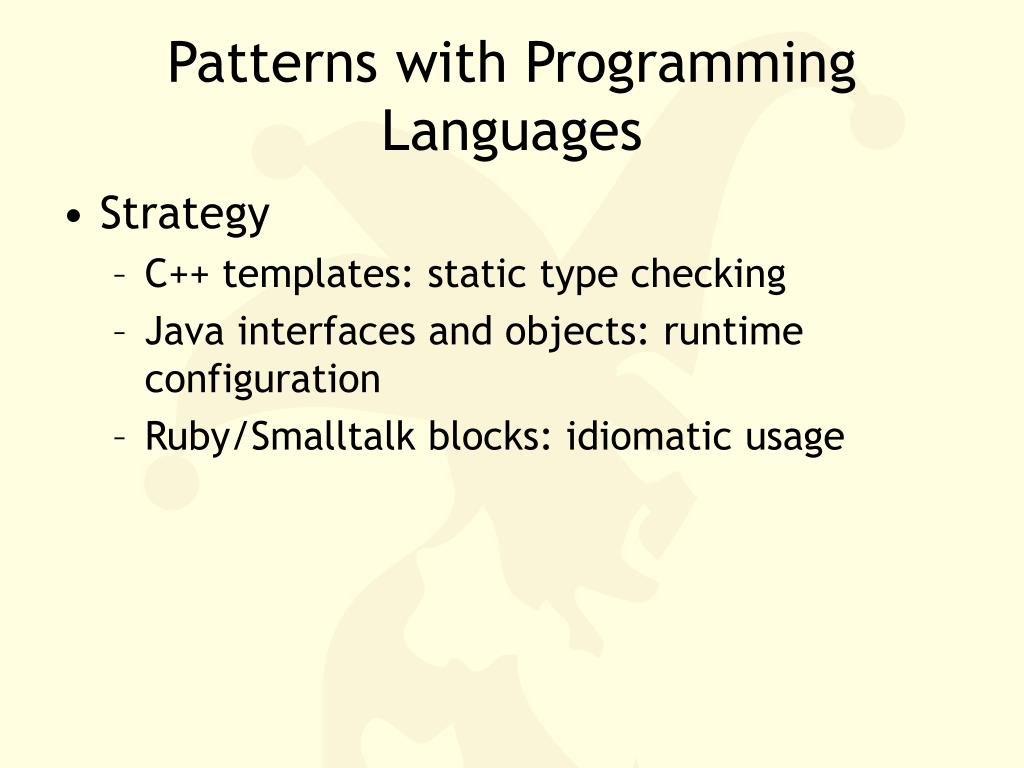 Tidak hanya Programming Patterns, anda juga bisa melihat gambar lain seperti Abstract Factory Pattern, Factory Method Pattern, Singleton Pattern, Adapter Pattern, Builder Pattern, Façade Pattern, Observer Pattern, Decorator Pattern, Strategy Pattern, Bridge Pattern, Architectural Pattern, Composite Pattern, Code Background, Computer System, Background For, Code Icon, FlowChart, Wallpaper 4K, Language Map, Background 4K, Language Wallpaper, Stock PNG, Transparent Logo, and Coding Background.