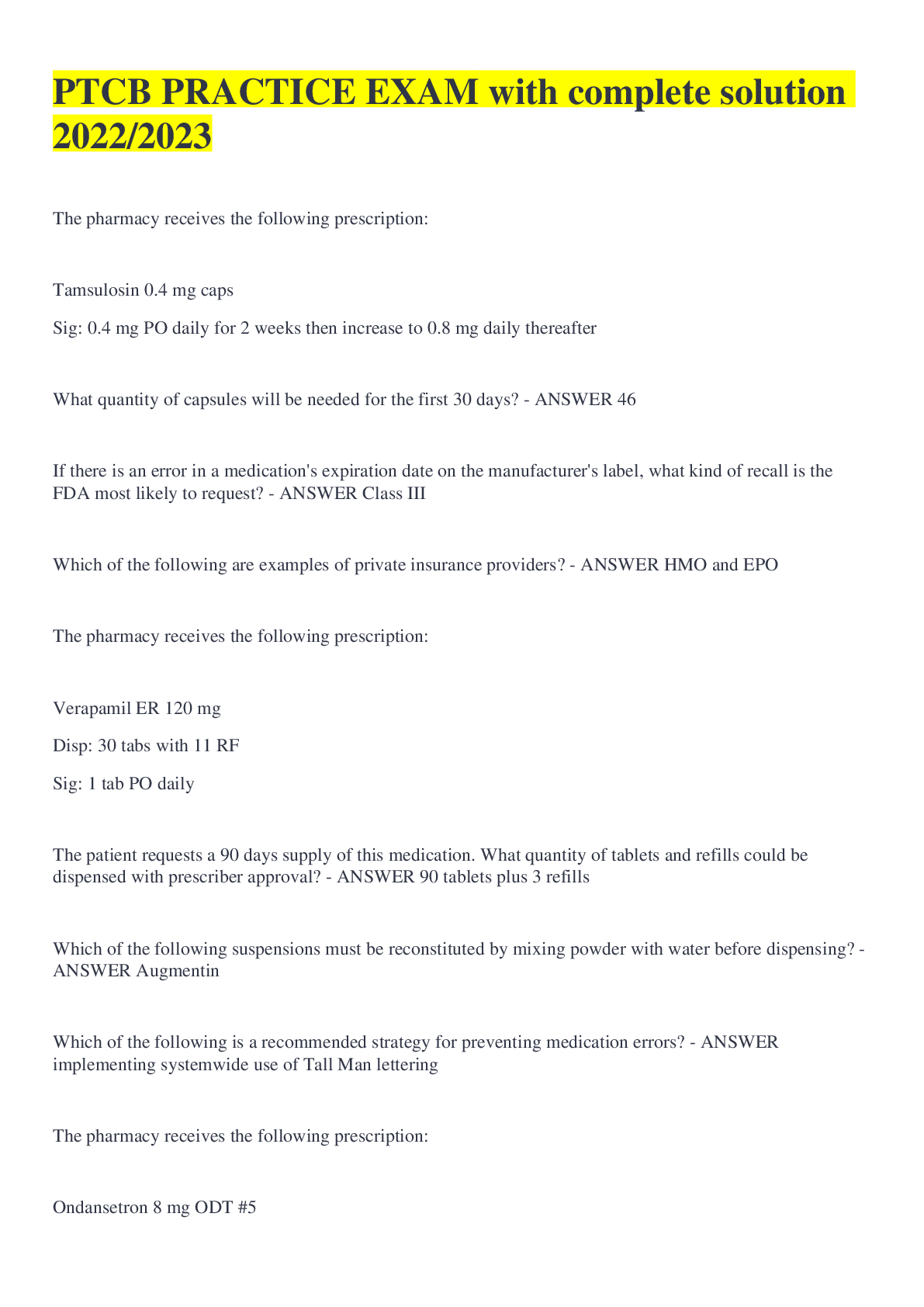 ptcb exam practice test questions answers exams medicine docsity