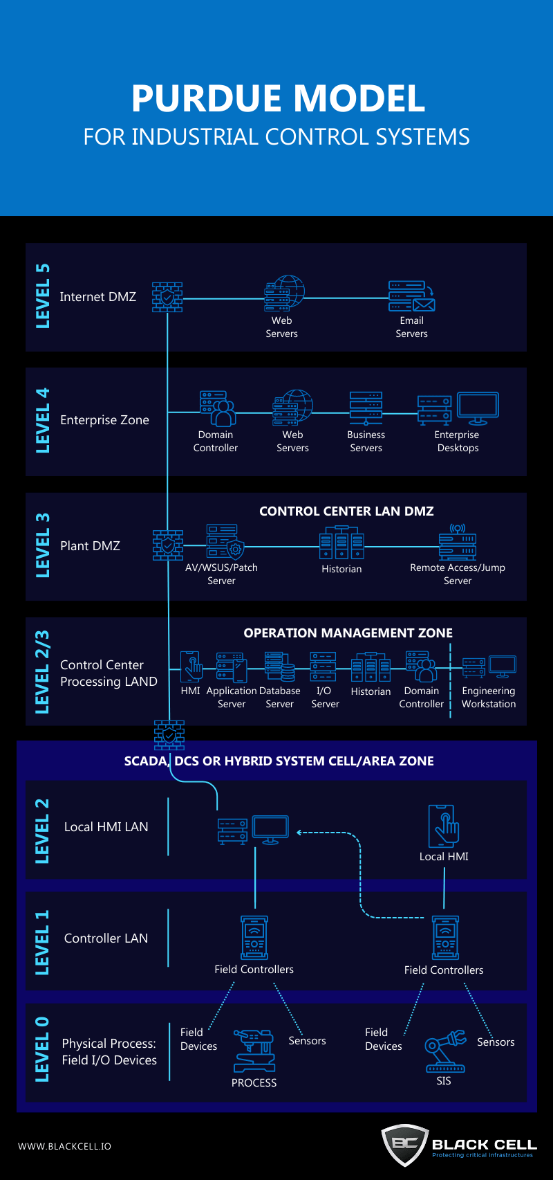 purdue model industrial control systems infographic black cell