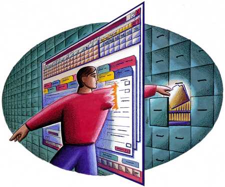 stock illustration man reaching computer screen file cabinet