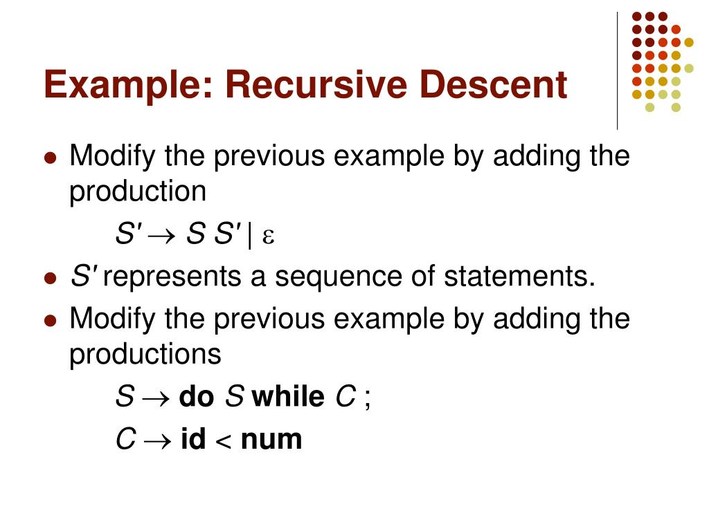 Tidak hanya Recursive Descent, anda juga bisa melihat gambar lain seperti Parser Example, Parser Tree, Parser Diagram, Parser Design, Parsing, Parser, Parsing PPT, Algorithm Visual, Parsing Example, Parsing CD, Pratt Parser vs, Parser Program, Ll Parser, Top-Down Parsing, Bottom-Up Parsing, Cyk Algorithm, and Scannerless parsing.