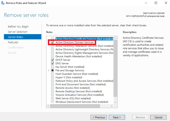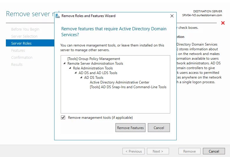 remove active directory domain services server manager
