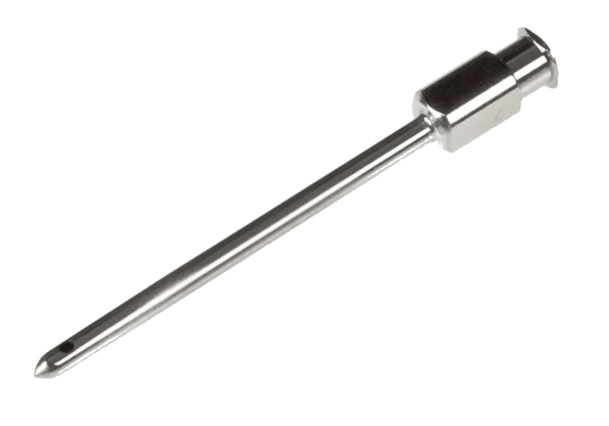 long sharp stainless steel needle fine point white background