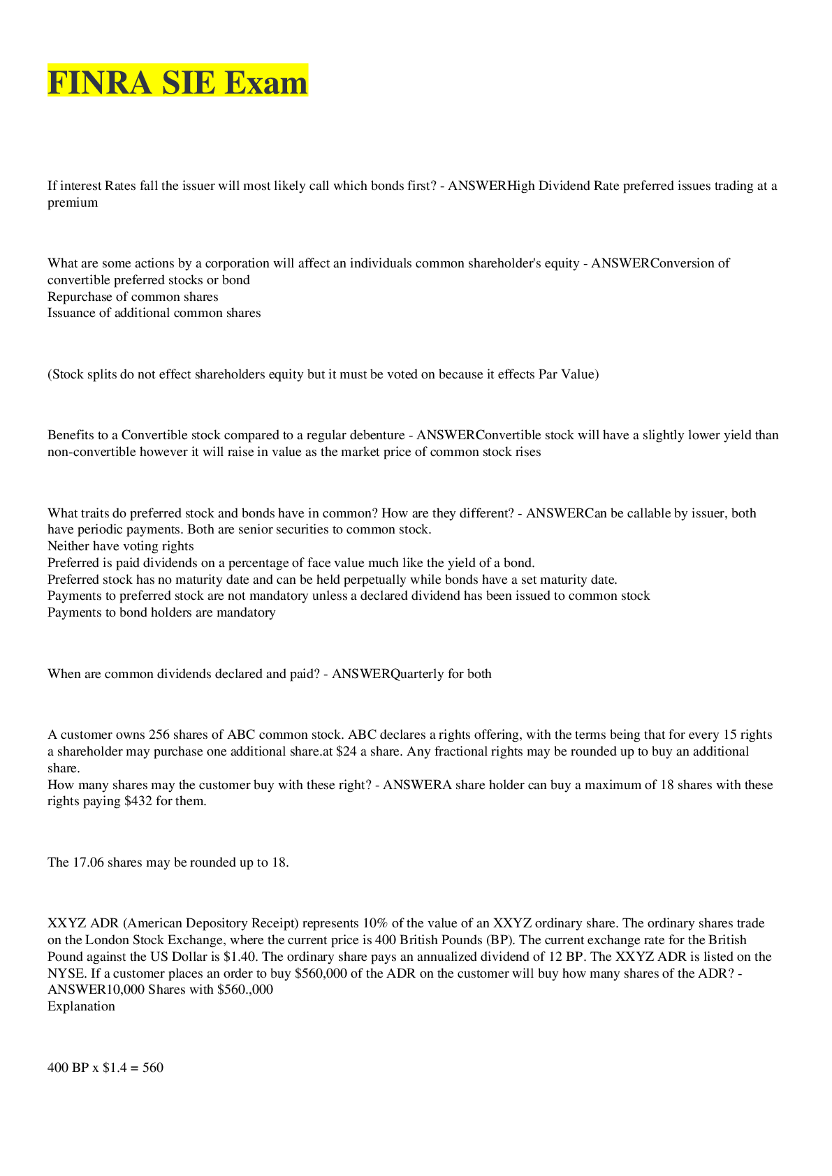 sie finra questions correct answers sie finra stuvia