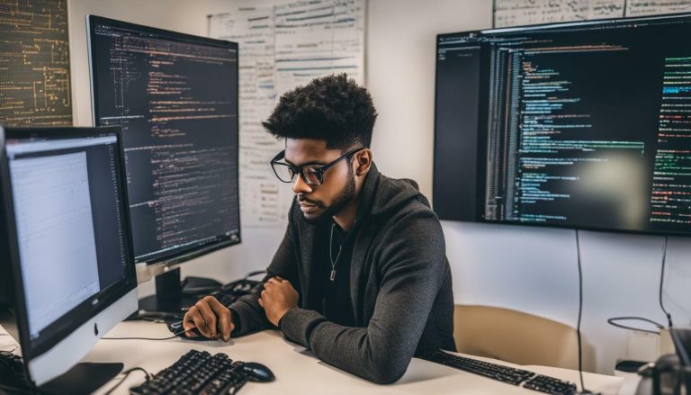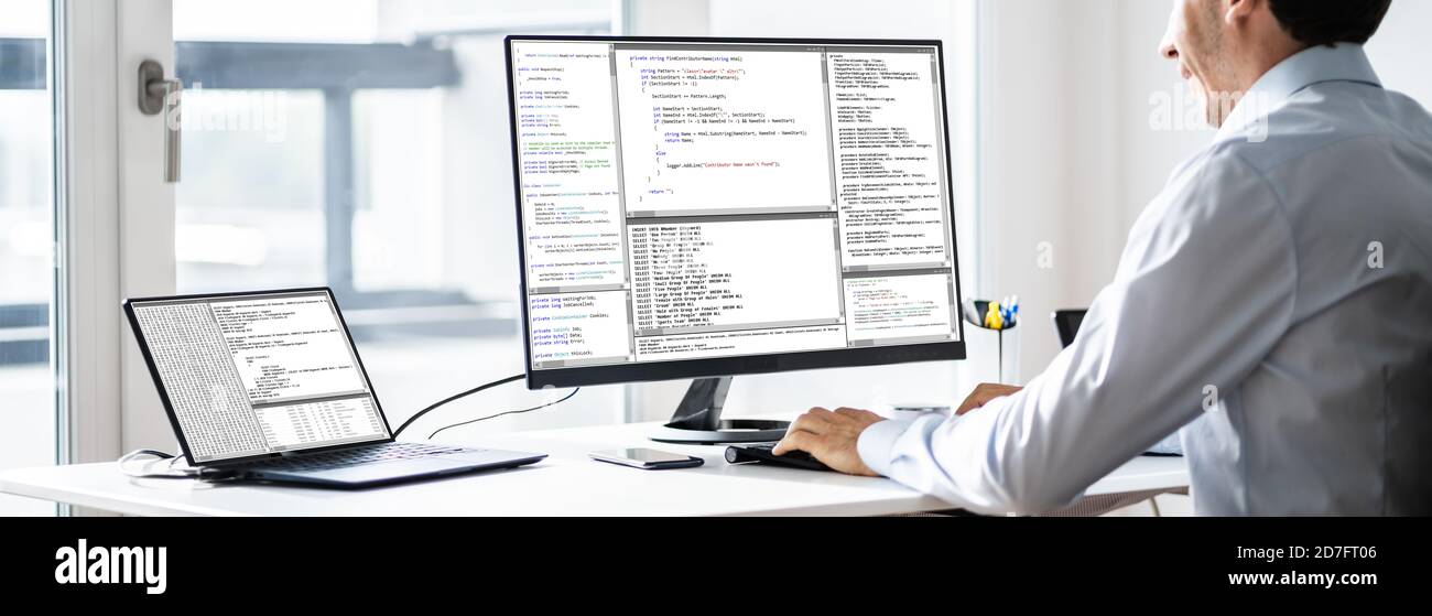 software developer programmer working computer office stock photo