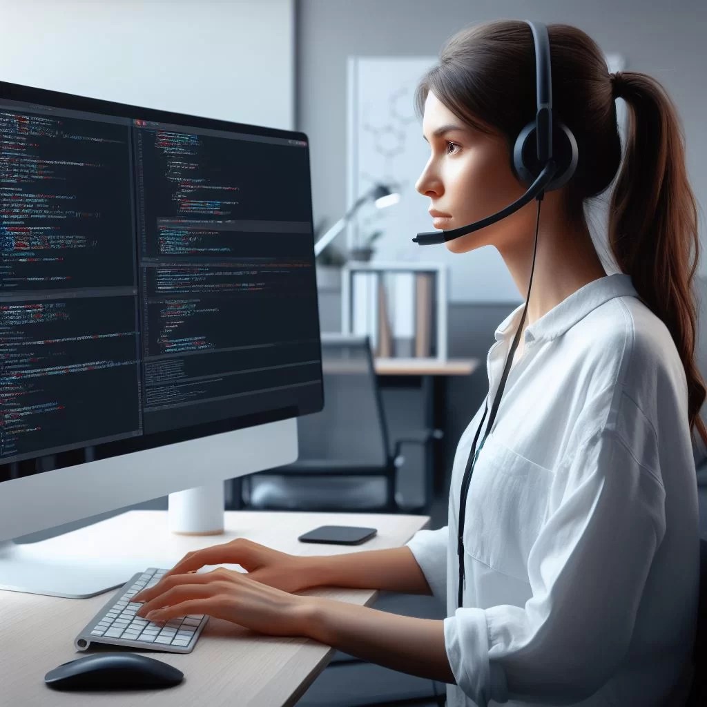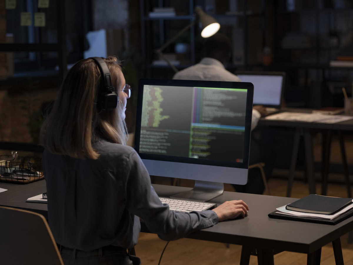 software developer working desktop computer evening office