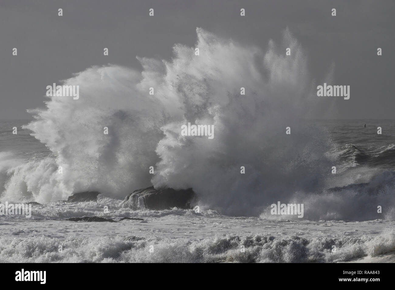 big splash waves breaking beach rocks stock photo alamy