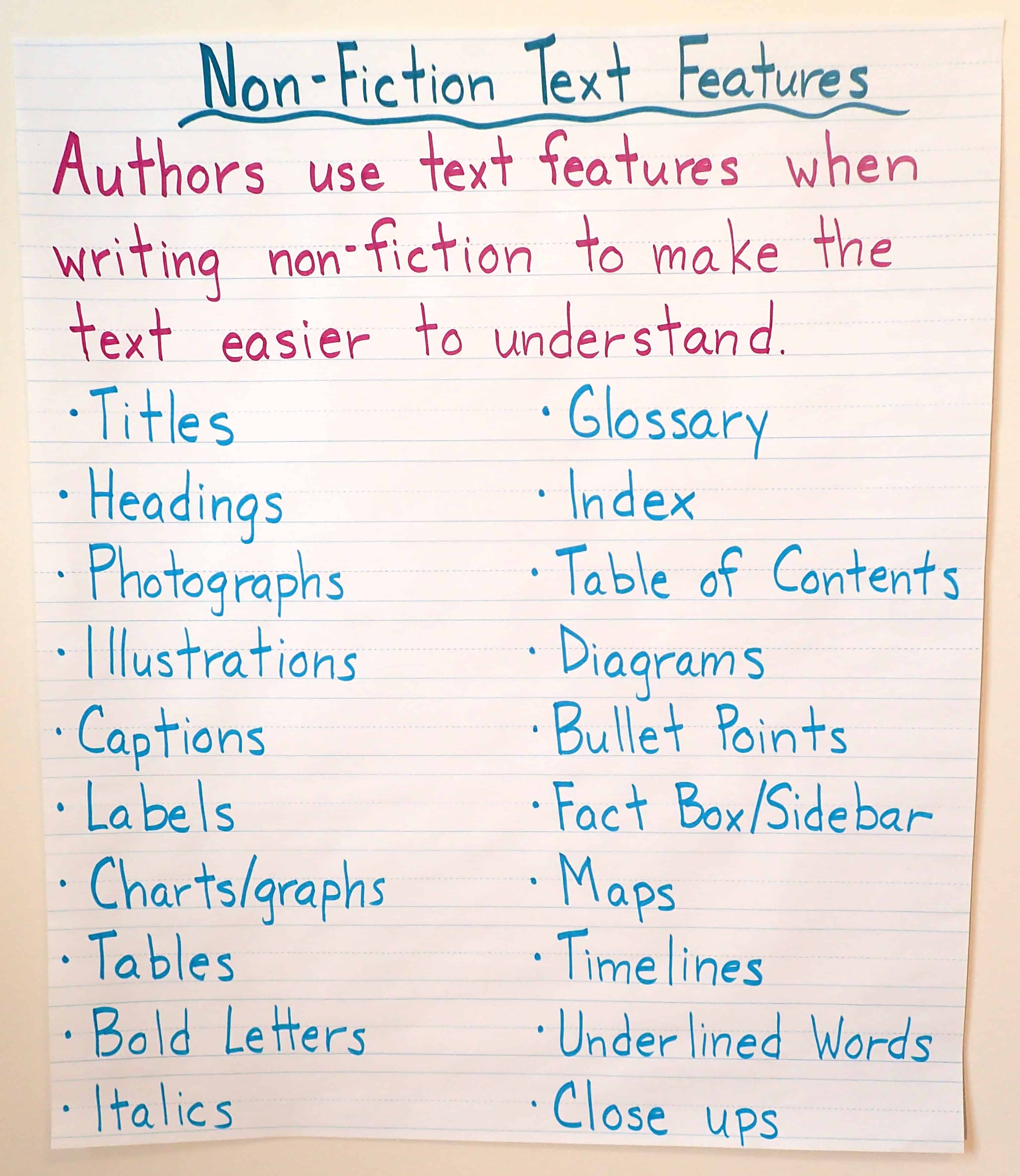 fiction nonfiction text features anchor chart