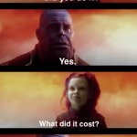 Tidak hanya Thanos What Did It Cost, anda juga bisa melihat gambar lain seperti Meme Generator, You Meme Template, Everything Meme, Gaming Memes, Cleveland Browns, More than You Know, Même Template, Meme No Caption, Meme Boys, Gamora, Genshin Mêmes, Overtime Meme, Thanos HD, MeMeMe, Price Meme, Storage Space Meme, Meme Twitter, You Thanos Meme, Quote, Maker, and You Mem Template.