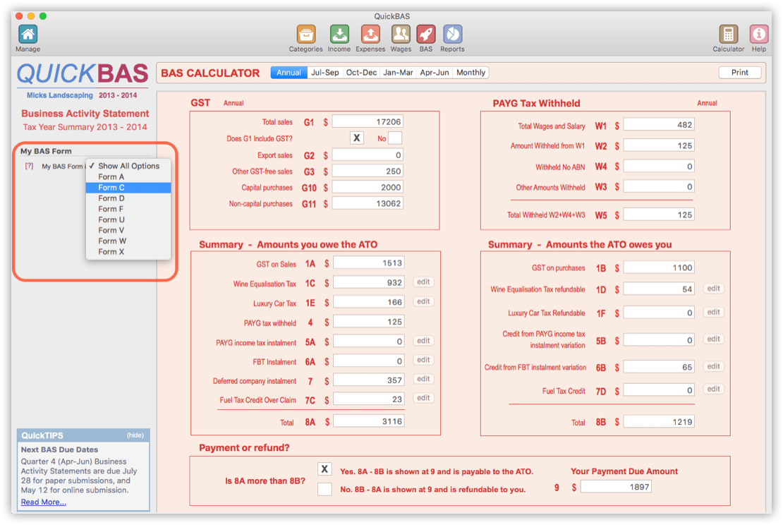 quickbas user guide business activity statement options