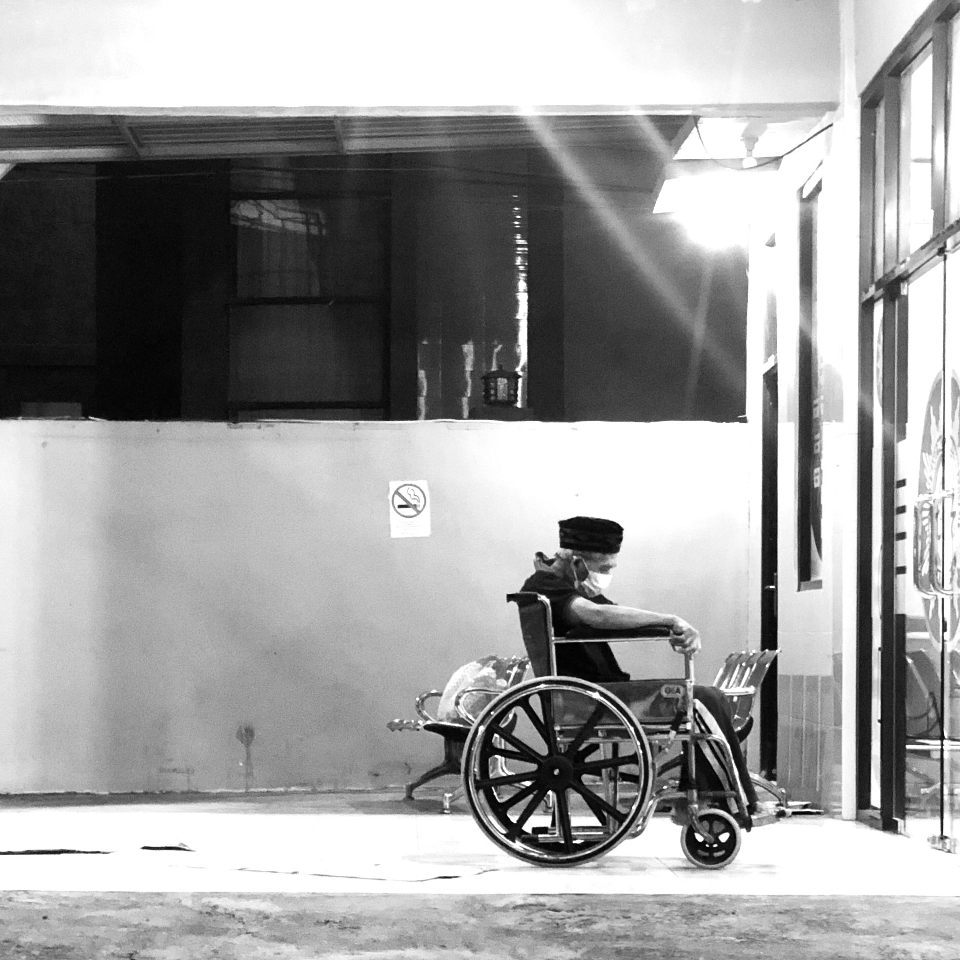 pakcik uzur masjid naik wheelchair berdiri solat pemuda liat