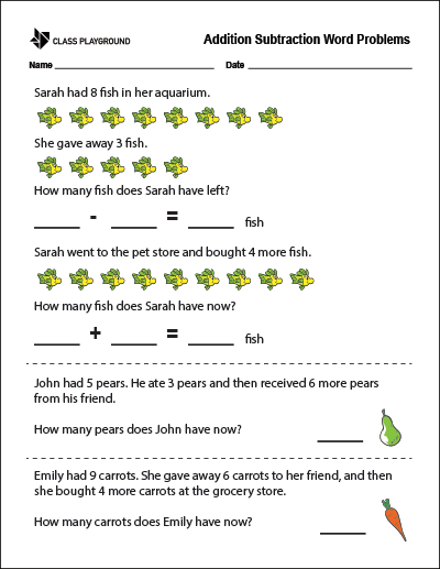 printable addition subtraction word problems worksheet class playground