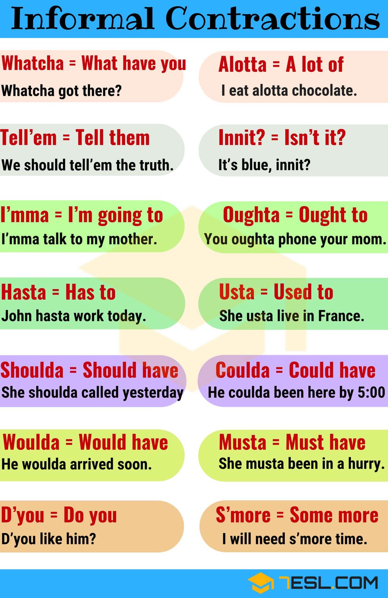 list informal contractions english learn english